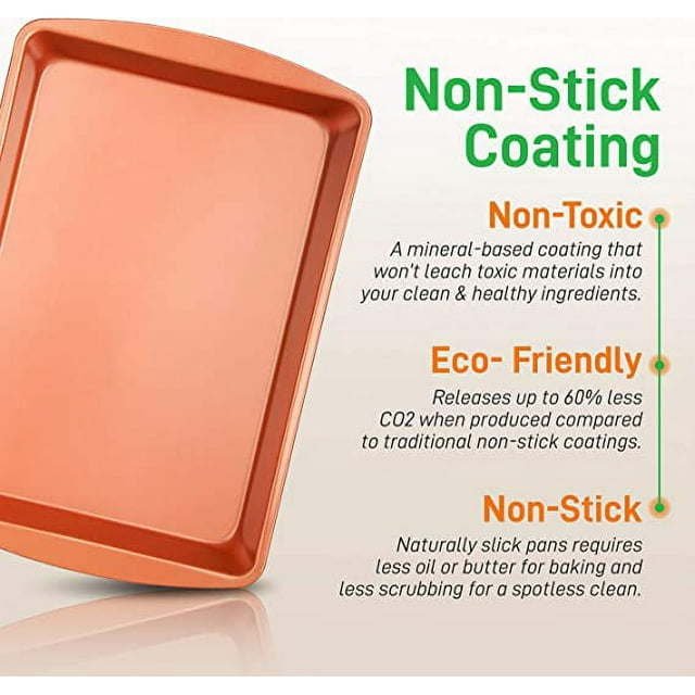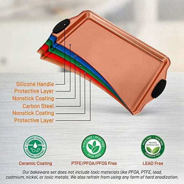 5 Pcs. Professional Home Kitchen Bake Pan Set - Commercial Grade Restaurant Quality Metal Bakeware, PFOA, PFOS, PTFE Free Features: • Professional Home Kitchen Bake Pan Set • Commercial Grade Restaurant Quality Metal Bakeware • Durable & Reliable Cookie & Muffin Sheet Oven Pan Style • Attractive, Stylish Non-Stick Metallic Coating • Dishwasher Safe • Long-Lasting, Stain-Resistant & Easy-to-Clean • Premium Food Grade Bake Pan Construction • Space-Saving Stackable Wide Tray Pan Design • Not Recommended for Microwave and Any Appliances that Use Fire • Ideal Use for Baking Cake, Cookie, Bread, Brownies, Lasagna, etc. • Used with Kitchen Ovens, Countertop Convection Ovens, Toaster Ovens • Great for Food Prep, Serving, Cooking, Sweet Treats, Pastry Dessert Baking • PFOA, PFOS, PTFE Free5-PIECE SET: The 5-Piece Baking Pan Set offers complete high-quality kitchenware for baking, sheet cakes, cookies, dinners, lasagna, and roasting vegetables. Includes small, medium & large cookie sheet trays, one rectangular pan, and a plastic lidNON-STICK COATING: Made from durable carbon steel metal & it's shielded w/ non-stick coating that eliminates the need for butter, oil, or cooking spray. Also for quick & effortless food release plus it does not emit any weird odor or smellOVEN SAFE UP TO 450 °F: Heat-safe even at high temperatures of up to 450°F which is ideal for baking a number of tasty baked goods or pastry. Make the most delicious chocolate fudge, cookies, cupcake, brownies, and can also be used as serving trayHEATPROOF SILICONE HANDLES: The commercial grade restaurant quality kitchen bakeware features red silicone handles to prevent accidental burns. Also stain-resistant, easy to clean & dishwasher safe but hand washing is recommended to extend pan lifeSTACKABLE DESIGN: The reusable professional non stick baking set features a space-saving stackable wide tray pan design for convenient storage. It is fully compatible w/ standard & convection ovens. Suitable for oven, refrigerator & freezer